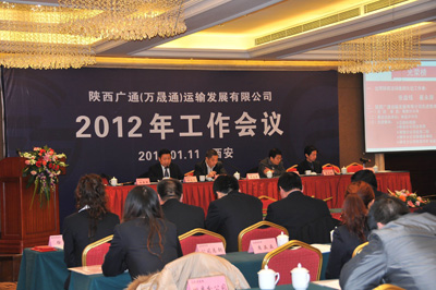 2012年1月11日,陜西廣通運輸發展有限公司、陜西萬晟通實業有限公司2012年工作會議在西安悅豪酒店隆重召開。陜煤運銷集團公司總經理助理、運輸中心主任譚志軍,陜煤炭運銷集團公司財務部經理、廣通公司財務總監和學謙,廣通公司董事長、萬晟通公司董事長任曉鵬,廣通公司總經理、萬晟通公司董事長助理沈來萬,萬晟通公司總經理孟立新,陜煤炭運銷集團公司運輸中心王江,以及廣通和萬晟通公司的員工代表共九十多人參加了此次會議。會議由廣通公司常務副總經理張益銘主持。